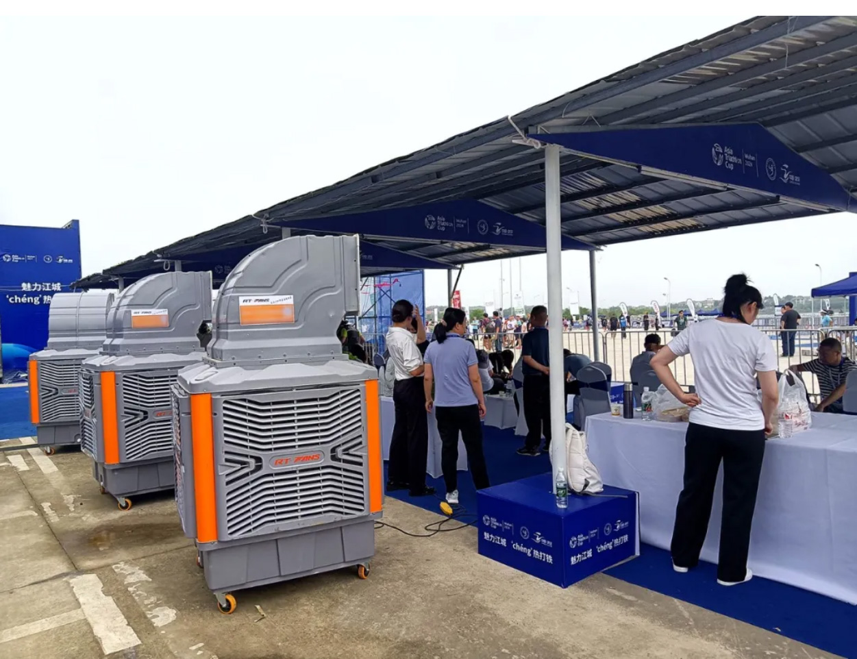 盡管進入9月中旬,武漢仍然持續(xù)高溫天氣,氣象臺數(shù)次發(fā)布高溫橙色、黃色預(yù)警,氣溫高達30℃以上,地表溫度逼近50℃。為此,瑞泰風(fēng)移動冷風(fēng)機再度臨危受命,馳援一線,這也是今年繼第49屆武漢渡江節(jié),2024年中國青少年公路自行車聯(lián)賽(武漢站)之后,瑞泰風(fēng)再度承擔(dān)武漢市的大型活動賽事降溫保障工作。